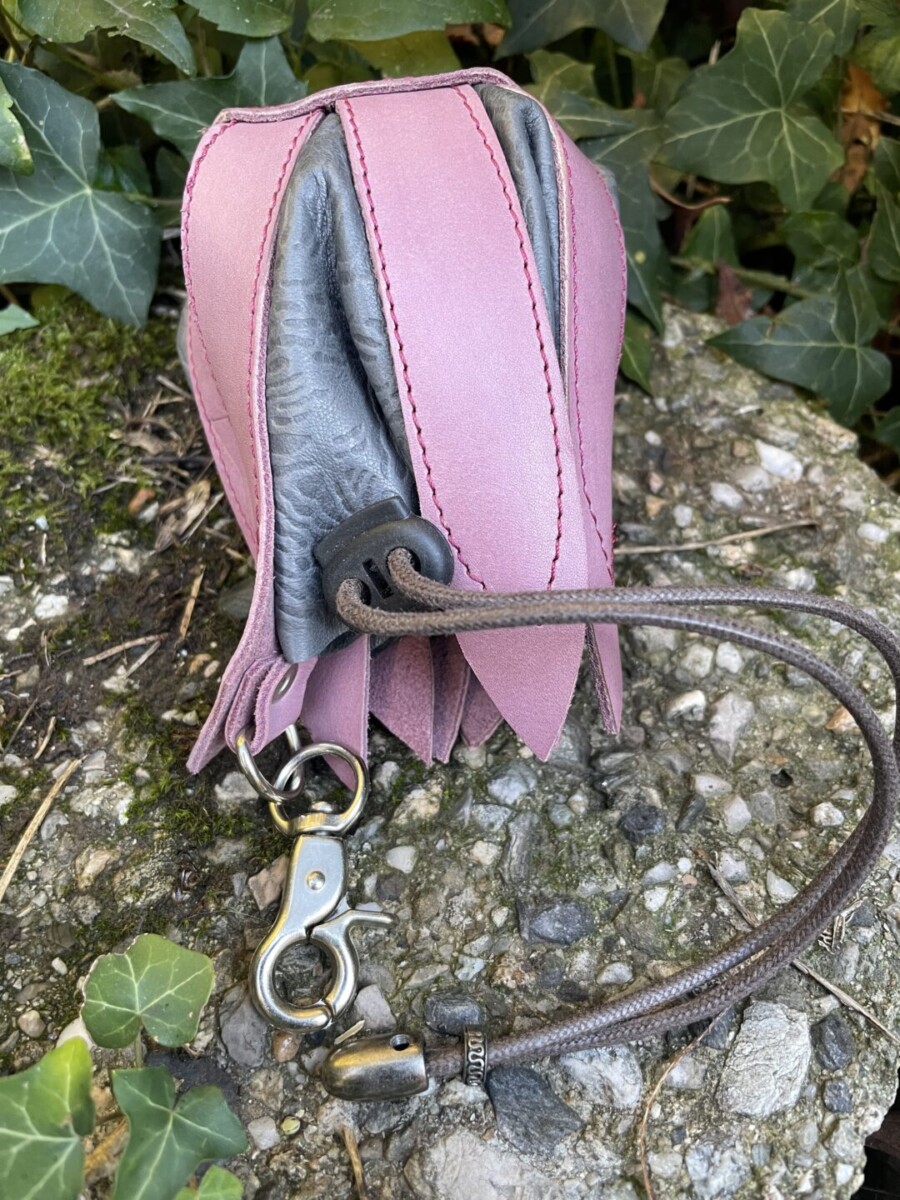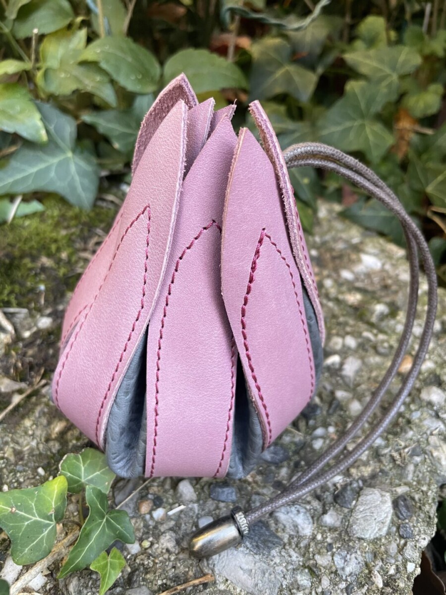 Porte-clé-bourse en forme de tulipe en cuir de veau gris/vieux rose